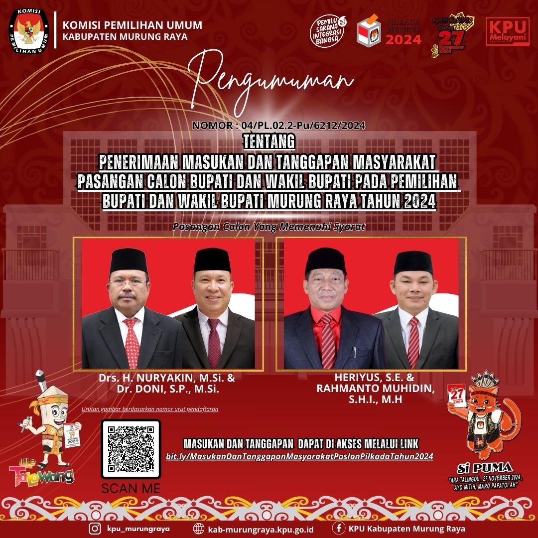 PENGUMUMAN PENERIMAAN MASUKAN DAN TANGGAPAN MASYARAKAT PASANGAN CALON BUPATI DAN WAKIL BUPATI PADA PEMILIHAN BUPATI DAN WAKIL BUPATI MURUNG RAYA TAHUN 2024